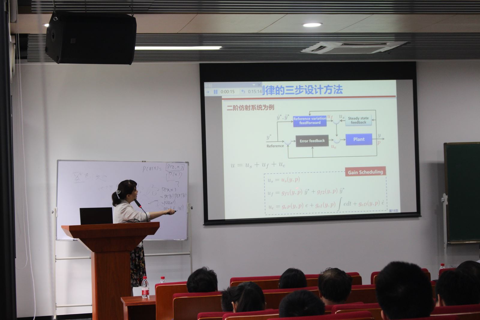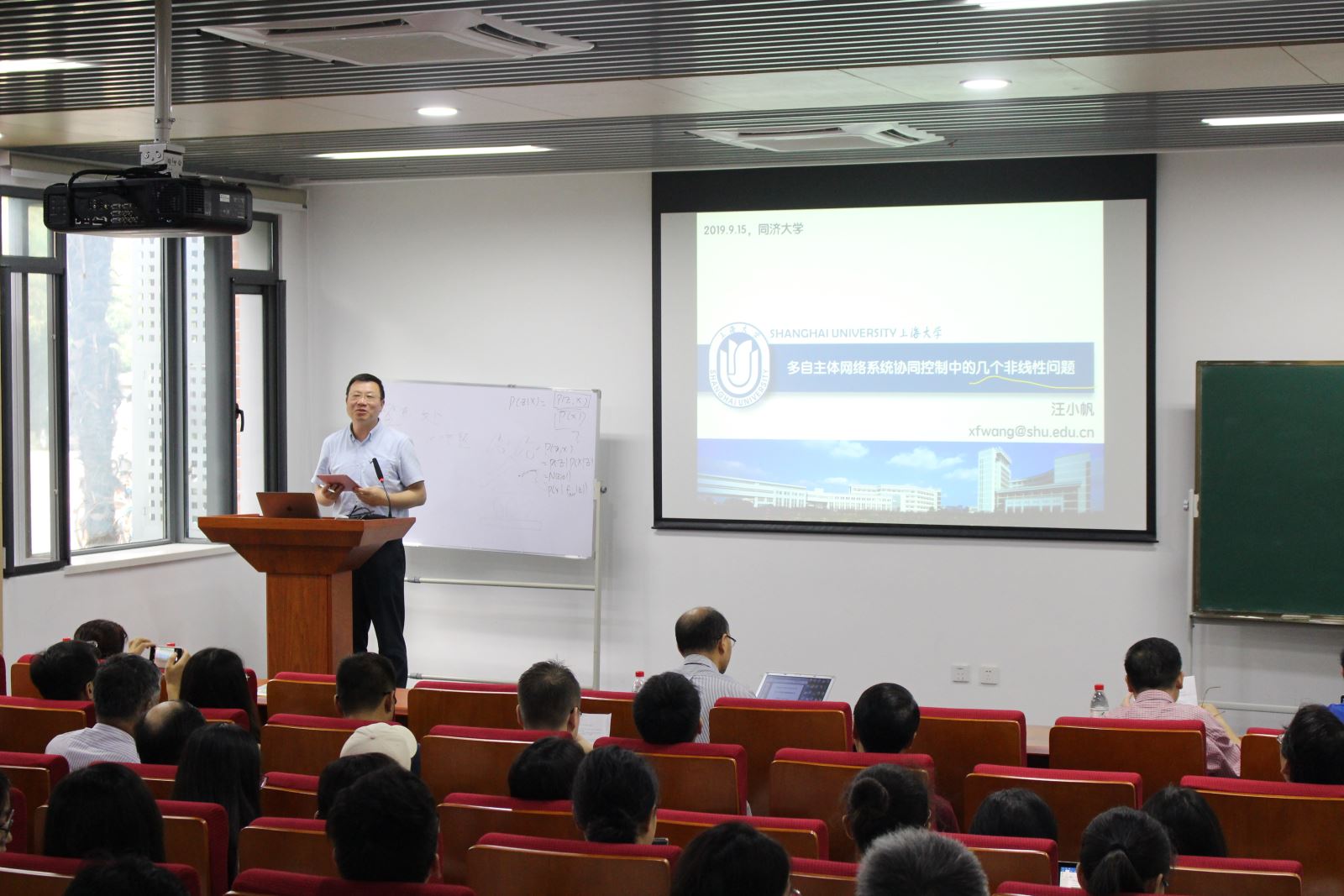 上海大学汪小帆教授作了《多自主网络系统的协同控制中的几个非线性问题》主题报告。汪教授介绍了其个人及团队近20年来所做的部分研究工作,主要是介绍了机器人巡逻配置问题的研究历程和最新研究成果,包括具有固定拓扑结构的同步性问题、具有变拓扑结构的Flocking问题、具有饱和输入的覆盖问题等。