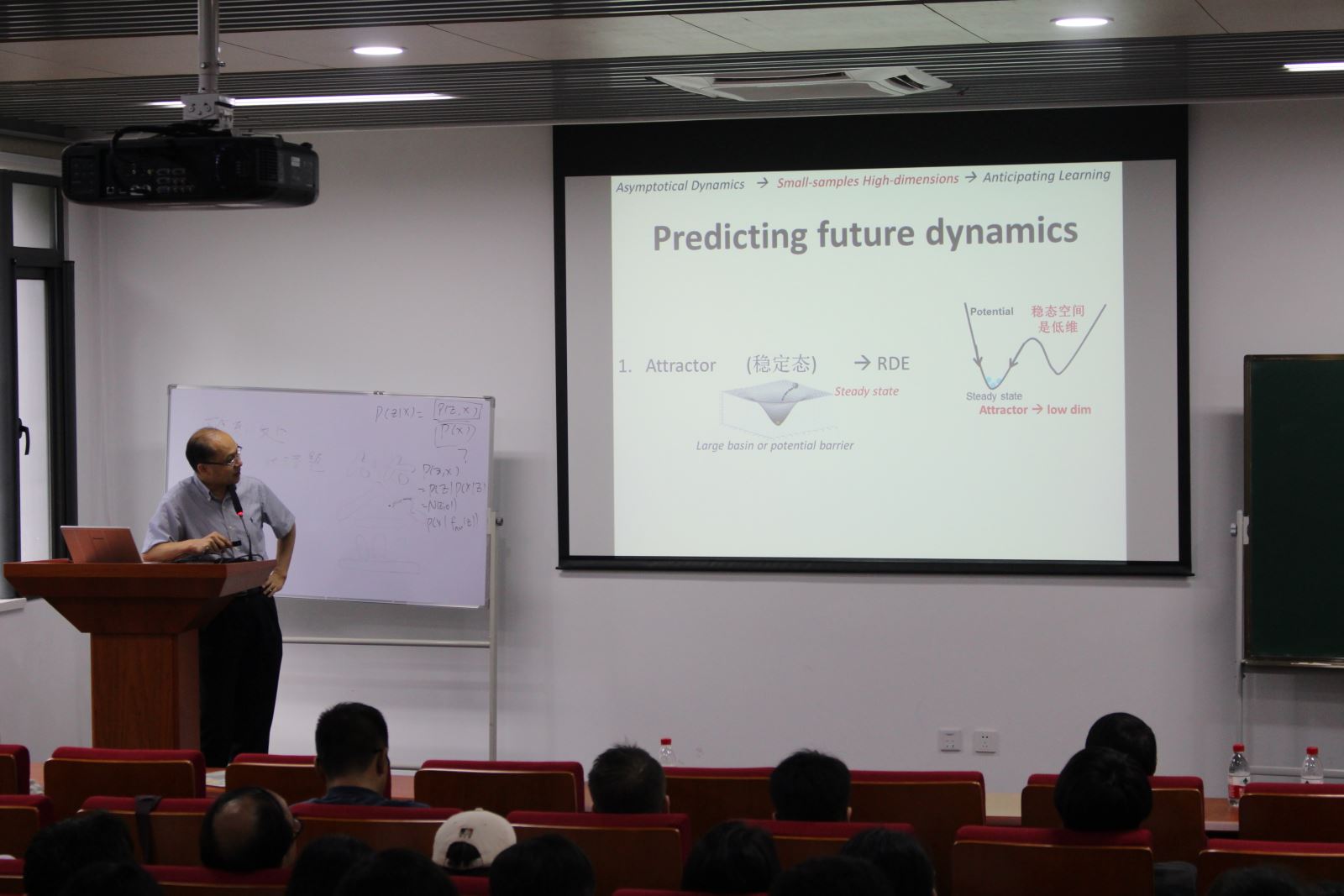 中科院上海生命科学研究院陈洛南研究员作了《基于动力学的数据科学》主题报告。他介绍了发病临界状态的基因检测以及DNB(Dynamic network biomarker)理论在其他学科中的临界现象分析中的应用。另外还介绍了利用Taken’s理论对基于动力学的小样本进行预测,为在座的师生研究非线性动力学预测拓宽了思路。