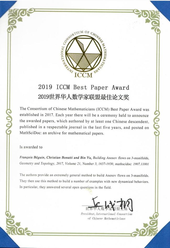 Recently, YU Bin, a young teacher of our school, won the 2019 ICCM Best Paper Award by International Consortium of Chinese Mathematicians for the nearly 100-page academic paperBuilding Anosov flows on 3-manifolds authored by two French mathematicians and him. SU Yucai, RUI Hebing, CHEN Xiaoyang, ZHENG Kai and others were honored with the distinguished papers (Ruo Lin Award).